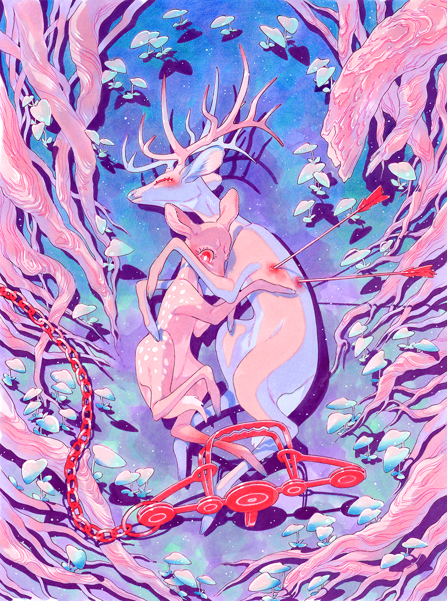 original piece is drawn in marker, coloured graphite, fine liners, acrylic ink